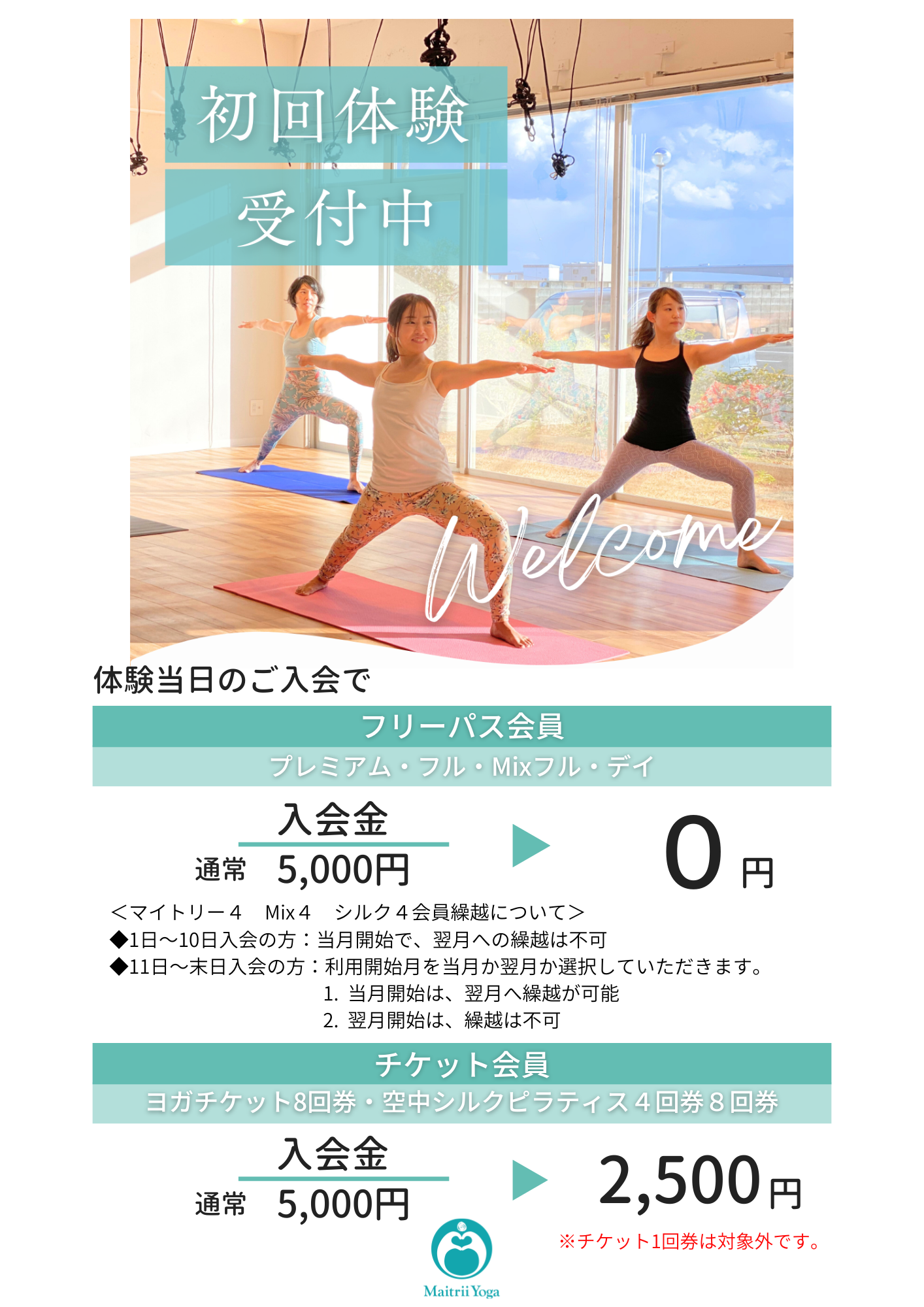 ・過去にヨガ体験を受講された方は以降のキャンペーンにおいても対象外とし、通常入会でのご案内をさせていただきます。予めご了承ください。
