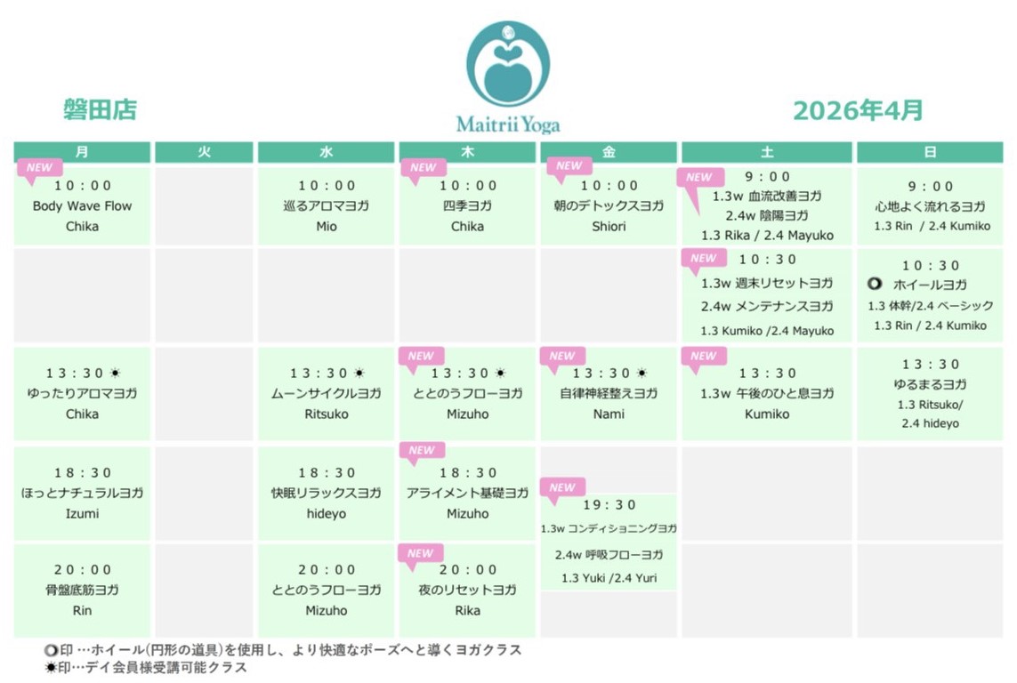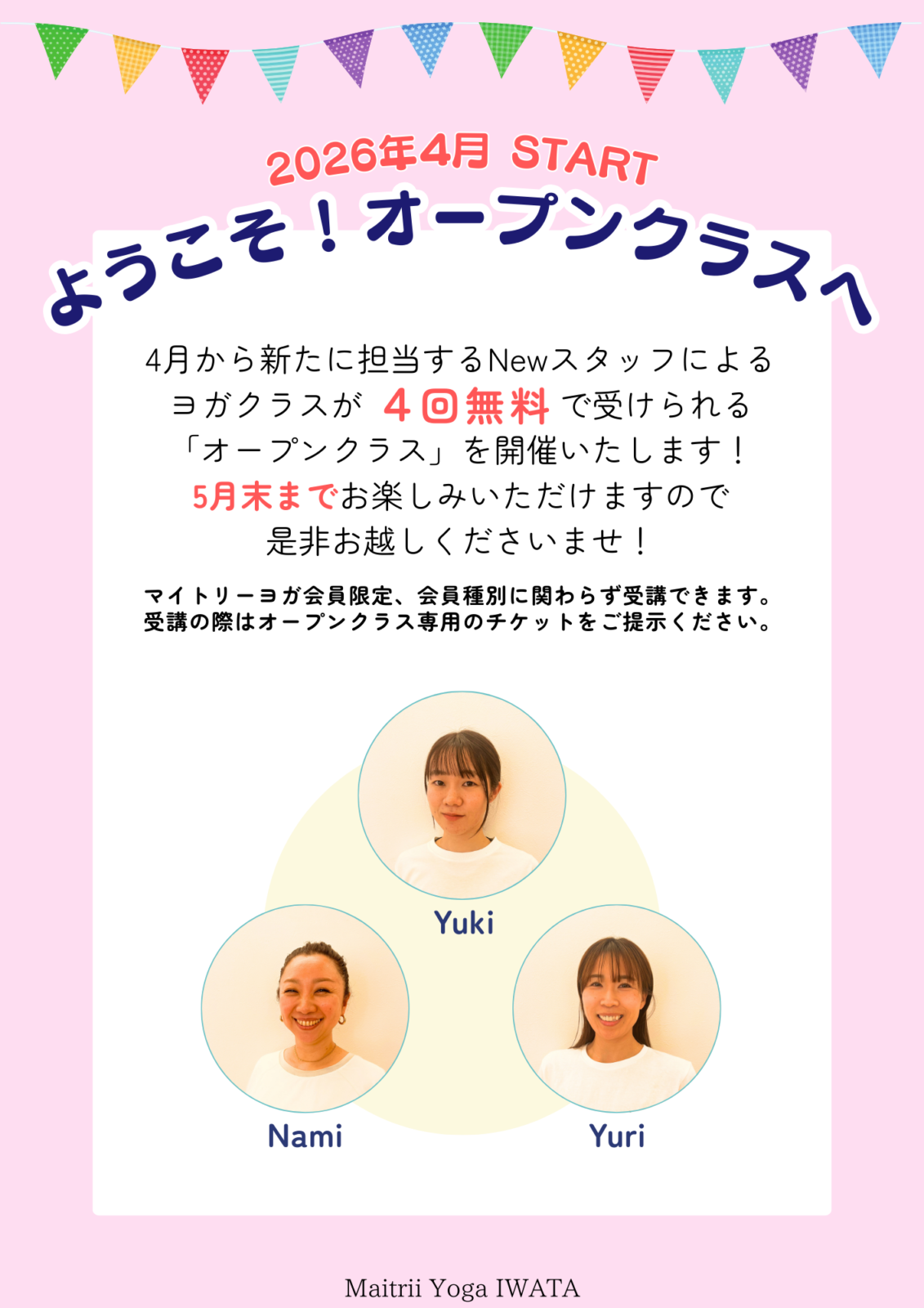 マイトリーヨガも新年度となり、4月スケジュール及び担当インストラクターが変更しております。HP及び店頭にてスケジュールをご確認いただきますようお願いいたします。