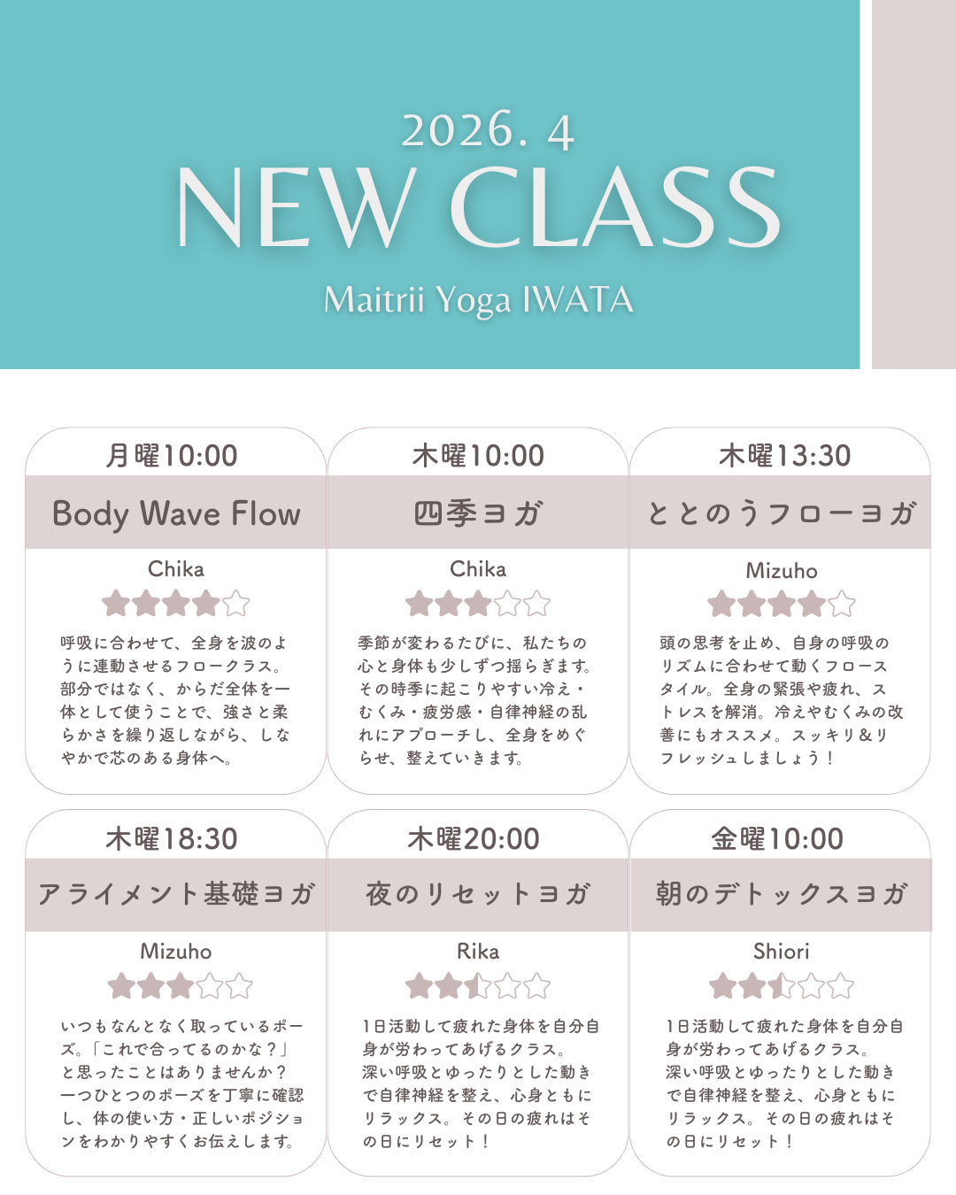 ストレスを感じやすい季節にぴったりな4月Newクラスをご紹介いたします。