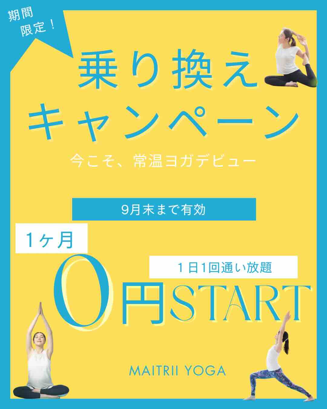 ・過去にヨガ体験を受講された方は以降のキャンペーンにおいても対象外とし、通常入会でのご案内をさせていただきます。予めご了承ください。
